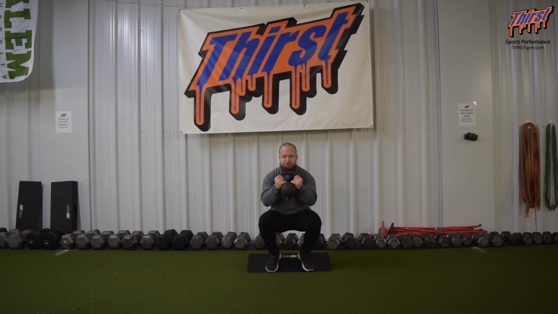 - Hold the kettlebell in a goblet or “hamburger” position at chest height