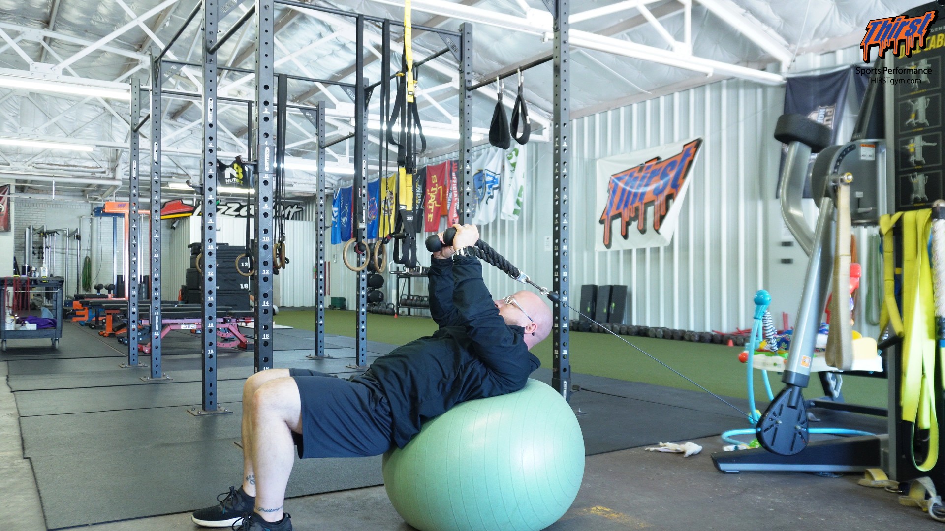 Position your stability ball approximately three to four feet away from the cable machine, adjusting this distance based on your arm length and the specific setup of your equipment. The goal is to create enough tension on the cable even in the fully stretched position while maintaining proper body positioning on the ball.